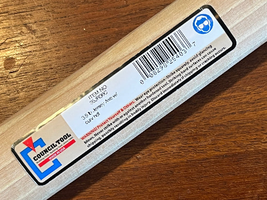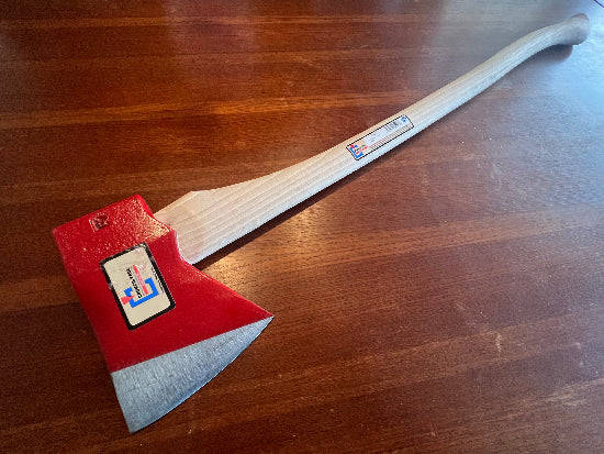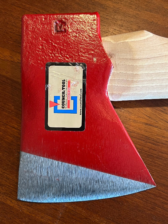 Premium quality New Old Stock Council Tool USA Made JERSEY PATTERN AXE with Curved Handle . We bought these axes about 8-10 years ago and they were not current tock then so I am not sure of the exact date of manufacture . The axes have been in warehouse storage and have small scuffs and marks but are otherwise new and beautiful ! The current model does not have a painted head and is of a different head design. The Jersey pattern features lugs on the head where the handle goes into it for added stability. The cutting edge measures approximately 5" wide and is very sharp. Due to the design of the head this axe excels at both chopping and splitting. The head is coated with red enamel paint and the cutting edges in clear lacquer to deter rust. The axes measures 35-36" overall and have a beautifully made curved American hickory handle. We have had several people tell us they prefer these older axes to the current models .