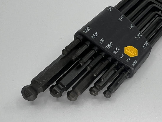 This top of the line German made set includes the following sizes .050, 1/16, 5/64, 3/32, 7/64, 1/8, 9/64, 5/32, 3/16, 7/32, 1/4, 5/16 and 3/8". The huge range is sizes makes this set very rare and useful. I have never seen ball end hex keys before that go down to this small of a size. The tools are all made of ultra hard and tough chrome Vanadium molybdenum tool steel. The ball end allows a full 25 degree angle entry. Premium quality. Will quickly become your go to set!