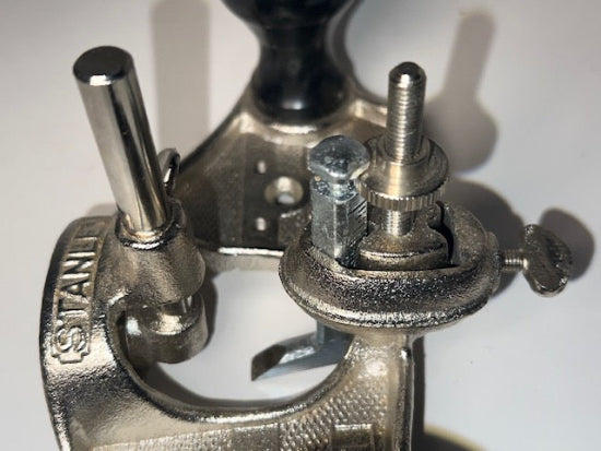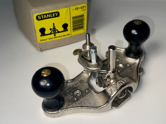 From the collection of an avid Plane collector is one never used Stanley Router Plane No. 71 complete and new in the box. Included is the plane with blade and fence installed as well as depth rod and shoe ( I think that is what it is called) . In the box is a paper package that includes 5 more blades. The 2 blades that have removable cutters have some light rust on them the others are all perfect and new. Original paperwork is included but has been crumpled. The blades have never been sharpened. The plane has been assembled but has never cut wood. It is perfect as far as I can see. The box has a tear in the top and has a part number written in ball point pen, it also has a date stamped on its end 23 NOV 1999. It has the original yellow and black paper label marked Stanley Tools Sheffield England 12-071 ( 71) . The body of the tool is marked Made in England. A very beautiful tool !