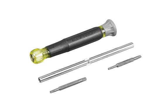 Featuring four TORX tamperproof bits in one tool, Klein's 4-in-1 Electronics Screwdriver is designed for precision work. The swivel cap provides optimum control. Made of the highest quality tempered steel, carefully heat-treated for maximum strength, and precision milled to fit screw openings securely. Cushion-Grip handles offer outstanding comfort and control. Corrosion-resistant chrome plated barrel that holds two double-ended bits.
