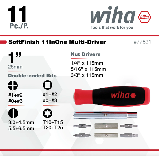 Wiha SoftFinish® 11inOne Multi-Driver features 8 essential screwdriver tip profiles for efficient tool carry. Introducing the comfortable, versatile, SoftFinish® 11inOne Multi-Driver from Wiha. It’s the trusted companion for whatever comes your way. Wiha SoftFinish® 11inOne Multi-Drivers are the standard for premium quality professional drivers featuring cushion grip handles for comfort and control and dual durometer construction for long-lasting durability. Including parallel-flats to prevent table-top roll-off, interchangeable bit, and nut driver receiver system for multi-tool adaptivity. Consisting of Wiha premium quality tool steel, the bits feature exact fit precision machined tips for reduced cam-out of fastener heads. The nut driver component is chrome plated and the double-ended bits phosphate finished for corrosion protection and surface resilience.  With the Wiha SoftFinish® 11inOne Multi-Driver, you have a trusted companion at the ready for nearly any driver application you face on the jobsite or at home.