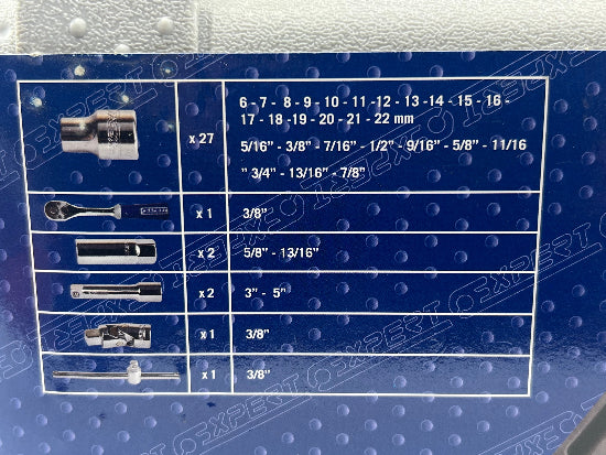 New Old Stock FACOM Tools Expert Line ( Expert Tools are FACOM'S value line , they are professional quality at a slightly lower price point, they are PART of the FACOM product line.They are marked only EXPERT although if you look closely you will see that the E for Expert is actually the same stylized letter that has been used for decades as the F for Facom)  E031811 - 3/8" Drive 34pc Metric and Imperial Ratchet / Socket set 6pt. Includes