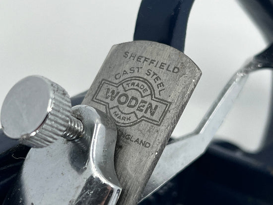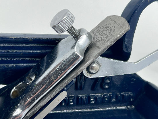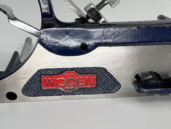 Lovely complete WODEN made in England No. W78 improved Rabbet and Fillester Plane with Double Fence. This beautiful plane was a competitor with Record and Stanley. Many believe it was the superior option. The plane features a double fence that was very sturdy  and easy to set. The knicker is unusual in its design . It is round with a tapered edge and a flat spot for when it is not needed. The front knob is lovely turned beech wood that has been stained a mahogany color. The blade is marked Sheffield Cast Steel Woden and Made in England. The integral cast tote still has the remnants of the decal on its top surface. The paint is overall in good condition but does have the usual nicks and chips from regular careful use. Overall it is in excellent used condition.