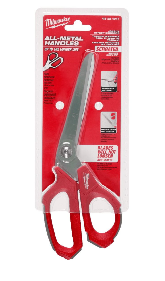 Milwaukee Jobsite Offset Scissors feature all-metal handles for added durability and up to 10X Longer Life. The construction scissors include a serrated cutting edge for increased force and grip. MILWAUKEE® Bolt Lock Technology prevents blades from loosening to ensure precision cutting. For added precision, ruler markings are on the front of the blades. Features
