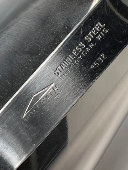 New Old Stock premium quality 1960's Volrath model 8532 made in Sheboygan Wis. USA Stainless Steel Graduated Measuring Cup. This beautiful unit is made of polished medical grade stainless steel and is perfect for a wide variety of measuring and storage applications. The cups are graduated in Oz with a 32oz capacity as well in CC's . 1CC equals 1ml . It has a 1000CC capacity so it therefore holds 1 litre maximum. The graduations and neatly and clearly stamped right into the interior of the cup to facilitate easy and accurate measuring. One additional bonus is that the graduation are not merely printed on and will not fade over time with use. The cup has a pouring spout and a large comfortable solid stainless steel handle that is rounded on the inside and flat on the outer edge making it easy to hold. Measures approximately 5-1/2" high.  Useful in the kitchen or workshop. Beautifully made!