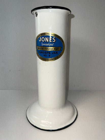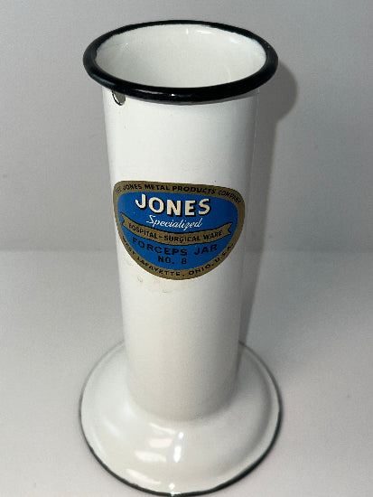 New Old Stock from long term warehouse storage 1960's vintage Jones Specialized Hospital -Surgical Enameled Ware Forceps Jar No. 8 made in West Lafayette , Ohio USA.  Originally made for medical use but makes a great decorative piece ( looks great holding flowers, chopsticks or artists paint brushes etc ) also a great  prop. May have small imperfections in the finish as these were made to be used originally not as a display piece. Very beautiful!