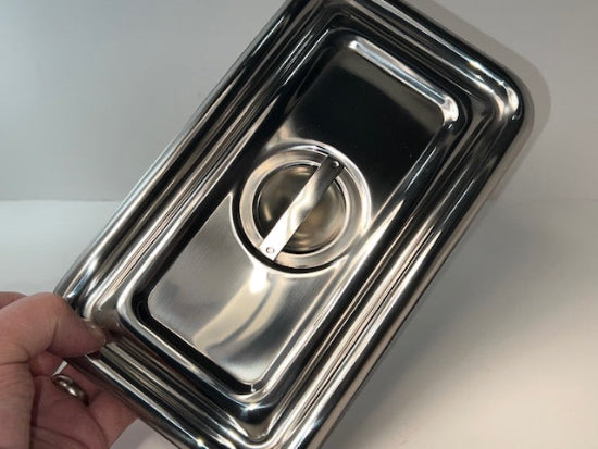 3 piece SET of New Old Stock 1950's or 1960's ( the base on the one I photographed has a date code of 8-57 indicating August 1957 but they may vary ) POLAR Ware ( VOLRATH) Stainless Steel Medical Instrument Trays with Lids. These stainless steel Instrument trays come complete with stainless steel lids to keep dust and contaminants out. The trays feature one piece construction with a lightly brushed finish on the stainless steel while the lids have a lightly brushed underside and a highly polished top surface. The lids are designed so that trays can be stacked for storage. Polar Ware is a division of Volrath and were made in Sheboygan Wis. USA back in the 1960's. They have since moved to Kiel Wis. USA. These premium quality trays measure 5-3/8" x 9-1/8" overall when the lid is on. Great for small parts storage, at a pic-nic to keep the flies at bay or many other storage applications around the house or shop. The trays and lids come wrapped in the original brown paper .Current retail on these is eye watering !