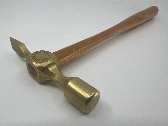 New Old Stock 2023 Lie Nielsen Brass Cross Peen Hammer. This beautiful hammer measures approximately 12" long ( the size varies slightly from one hammer to another) overall. The handle is made from black cherry that has been and polished and features a Finely machined solid brass cross peen head. The head has a lovely etching on it. This hammer was made Sept 12  2023 as stamped on the bottom of the box. This hammer was purchased by a collector and kept in storage since it made. There is some very slight greenish tarnish from this time in storage. A very beautiful tool that is often hard to find.