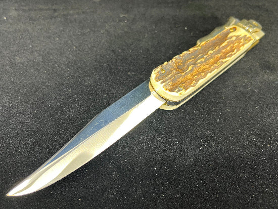 New Old Stock HUBERTUS Germany "Pigsticker" Folding Swing Guard Bowie Knife with Stag Handles.
